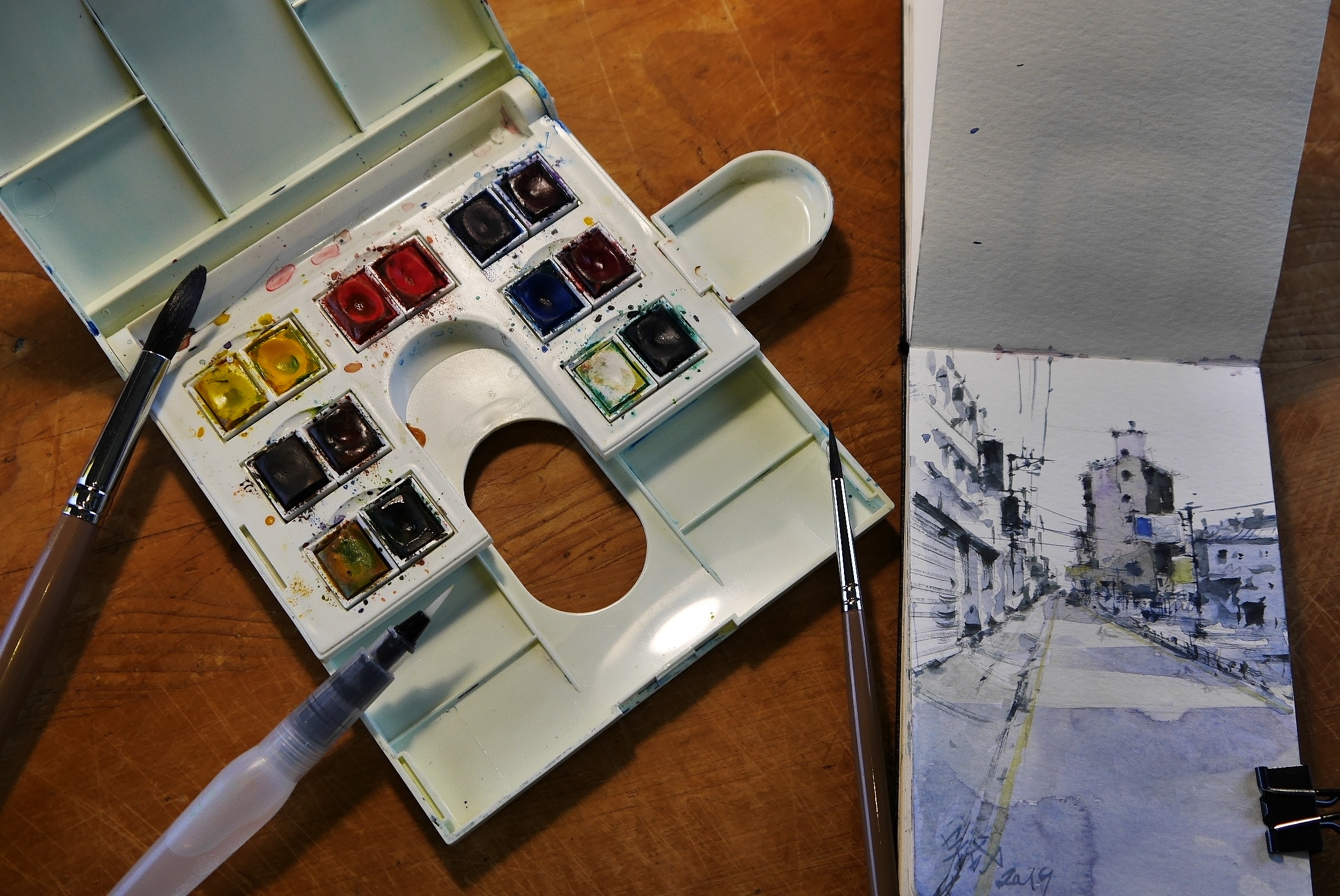 1.塊狀(固體)水彩(12~24色)-因為顏料與調色盤都做在一起,有的裡面還附上一支水彩筆,所以只要帶瓶水和一本水彩小冊子就可以輕鬆作畫,使用起來相當方便,但是因為調色面積較小,如果畫八開以上的作品就會比較吃力。