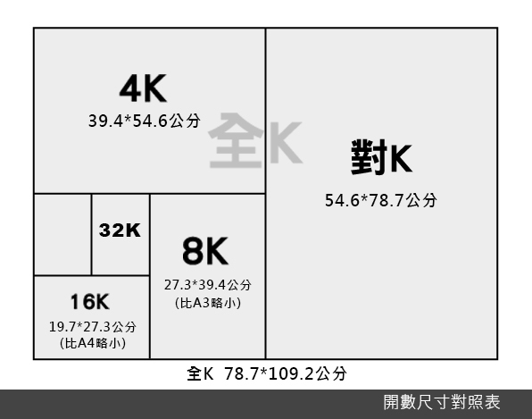 32K、64K……以下如此類推,每家紙廠的規格略有不同,以上尺寸只是約略,如要精準或者是特殊尺寸就需要自行裁切囉~