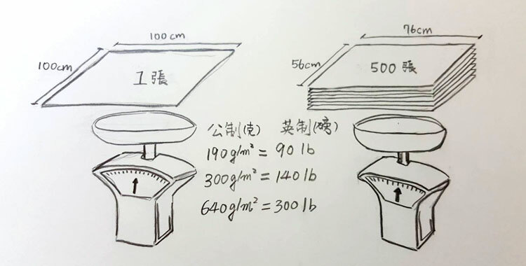 將1張100×100cm 的水彩紙秤重後為300公克(g),這張紙的厚薄我們就稱為300克(gsm 、g/㎡) 的紙,這就是公制的計算方法。