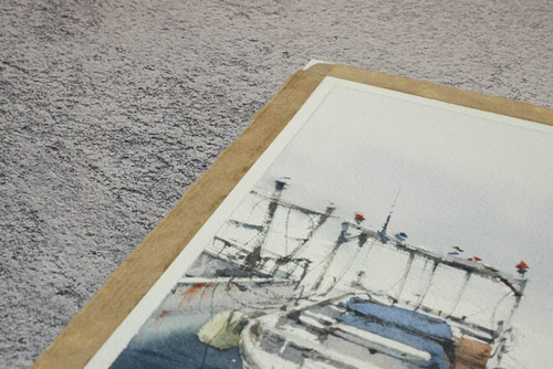 ↓ 下圖就是作畫前有用水裱,完成後與襯卡平整密合的效果。