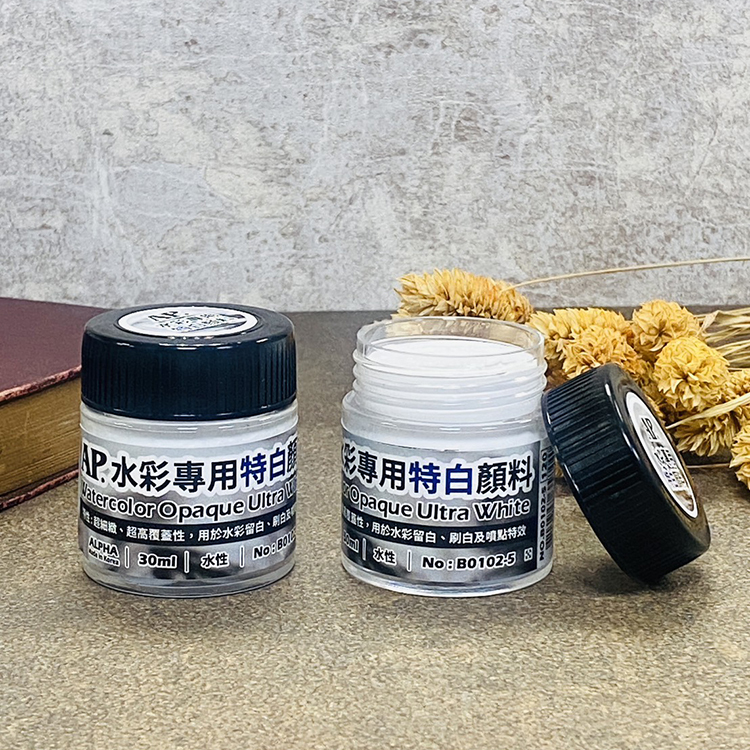 以極細的白色色粉製成,濃度高覆蓋性極佳,可溶於水,專為設計及繪畫修正用或點光線亮點用。