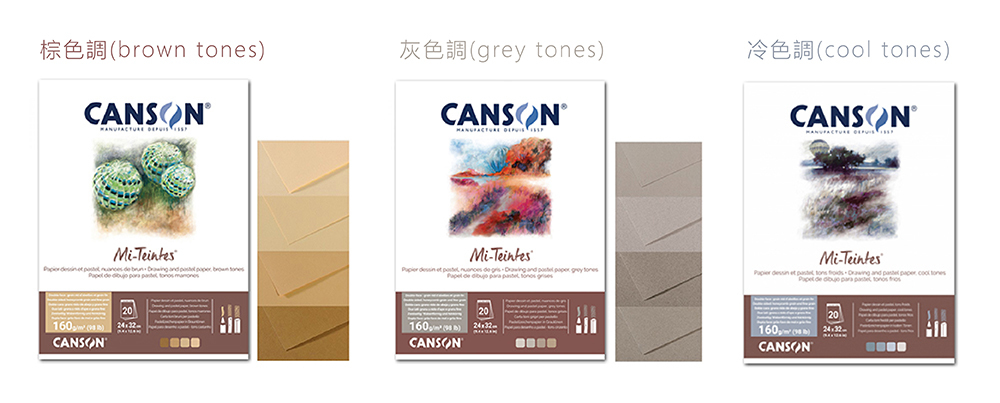 法國粉彩本紙厚160g,有棕色調(brown)、冷色調(cool)與灰色調(grey)三款,每款色調有4色各5張。每本20張。