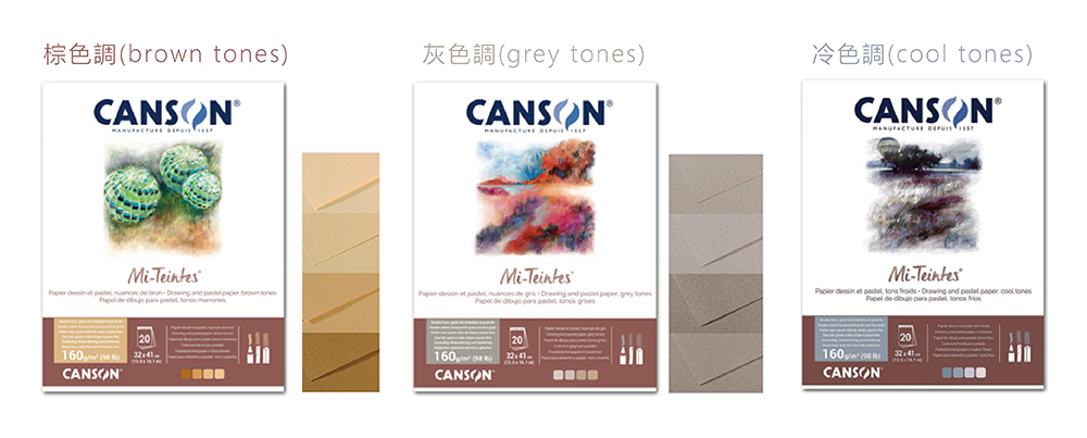 法國粉彩本紙厚160g,有棕色調、冷色調與灰色調三款,每款色調有4色各5張。每本20張。