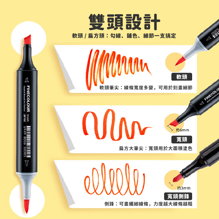 Finecolour法卡勒3代軟頭酒精性馬克筆,選用日本進口筆尖,一頭為6mm斜方筆頭;另一頭為軟筆頭(Brush),筆觸變化豐富,手感舒適,是市面上最高階的專業款軟筆尖麥克筆。