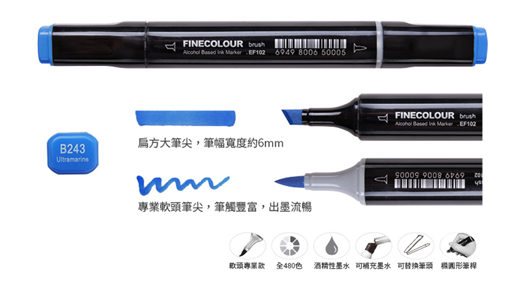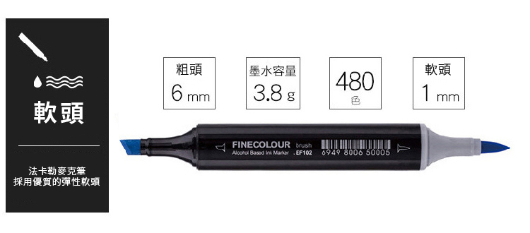 Finecolour法卡勒3代軟頭酒精性馬克筆,選用日本進口筆尖,一頭為6mm斜方筆頭;另一頭為軟筆頭(Brush),筆觸變化豐富,手感舒適,是市面上最高階的專業款軟筆尖麥克筆。