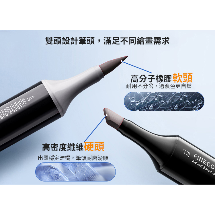 ● 軟筆頭(Brush) -每包5入,高分子橡膠軟頭,繪畫絲滑,顏色過度自然,靈活且易於操控,可輕易繪製線條的粗細變化,適合漫畫及服裝設計使用,是目前市面上最高級的軟頭筆尖。