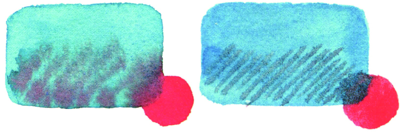 上圖中,左側為未添加好賓阿拉伯膠的疊色效果。而右側為添加好賓阿拉伯膠後的疊色效果。