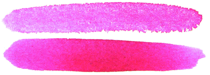 上圖中,上方為水彩顏料所繪出的筆觸。而下方為水彩顏料和好賓牛膽汁混合後,在同一張紙上所繪出的筆觸。
