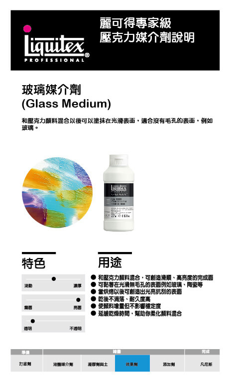 和壓克力顏料混合以後可以塗抹在光滑表面,適合沒有毛孔的表面,例如玻璃。