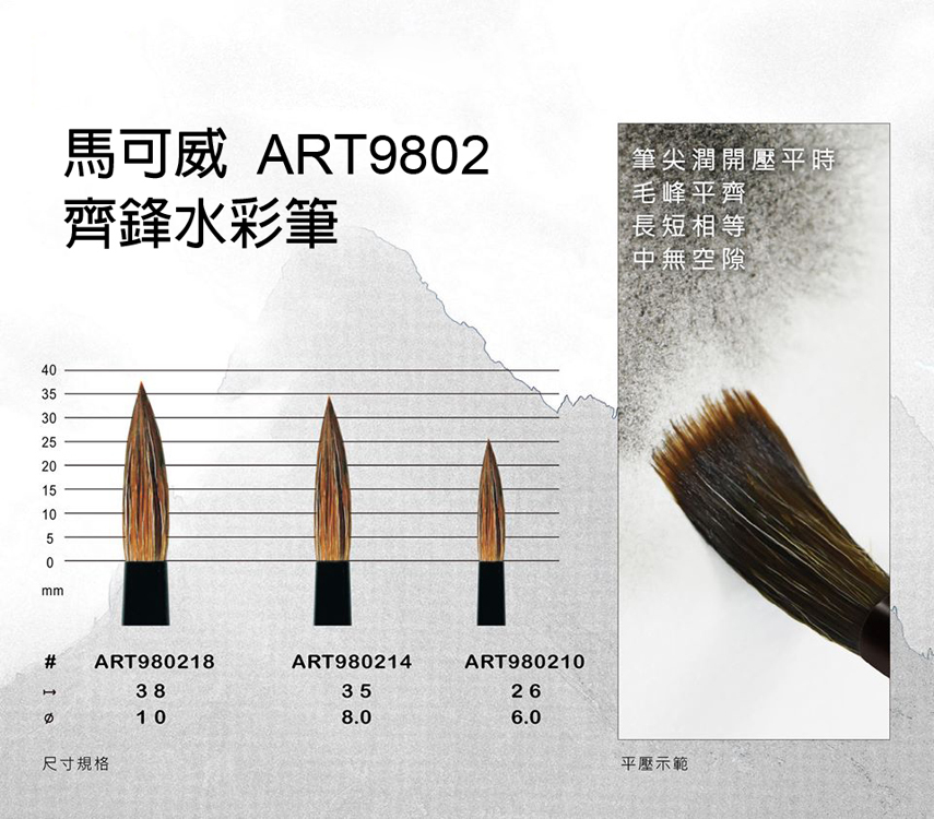 以高級牛耳毛與合成纖維混合製成,筆毛的彈性聚合性和含水量均佳。
