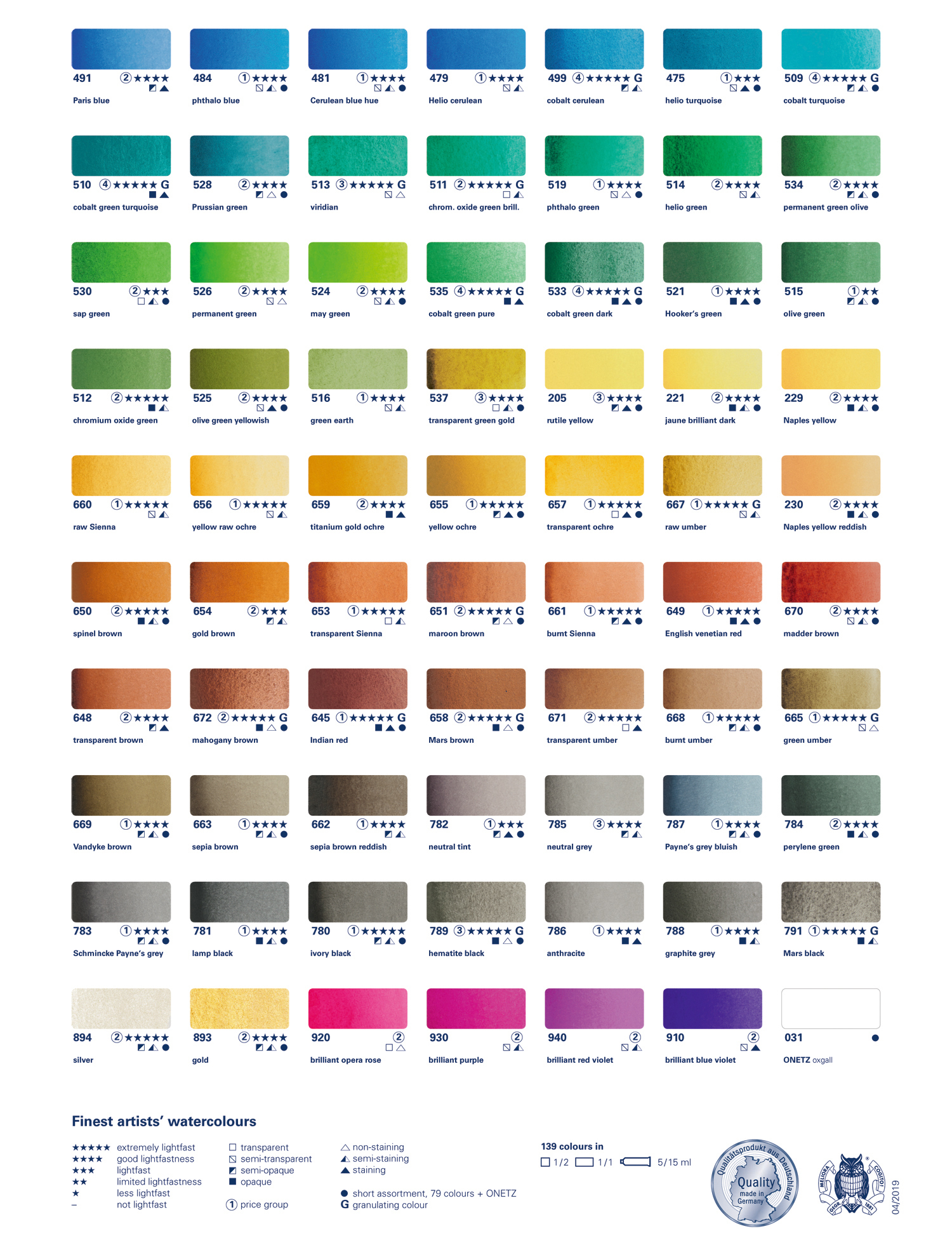 ●全系列共139色,其中具有最高耐光性的高達112種顏色(4星和5星),其中95色是單一色粉,完美作品絕對經得起時間考驗。