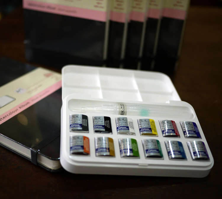 乾燥的塊狀水彩,用濕潤的筆輕抹即可溶解作畫,畫完直接蓋上盒蓋放入隨身包包,攜帶方便。